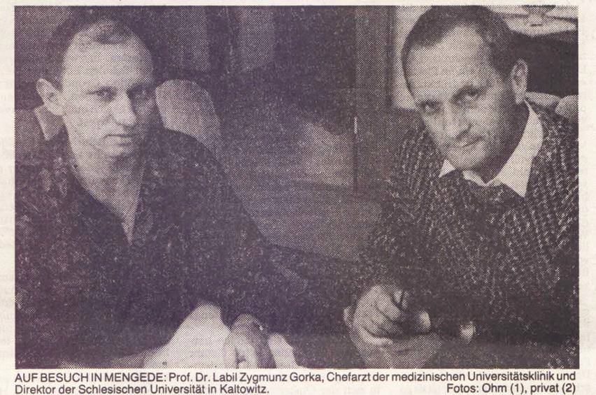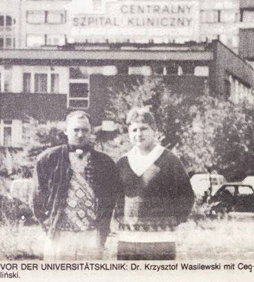 Tadeusz Cegliński z dr. Krzysztofem Wasilewskim przed Centralnym Szpitalem Klinicznym w Katowicach, 1990 r.