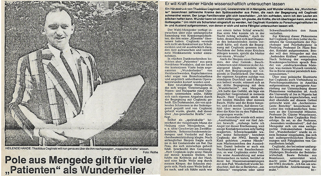 Do bogatej biblioteczki dokumentów potwierdzających skuteczność niezwykłej mocy dotyku Tadeusza Ceglińskiego dołączyły informacje prasowe, rozprawiające o jego darze i skuteczności w podejmowanych działaniach terapeutycznych (np. Nord-West Zeitung z dnia 16. 08.1986). Wszystkie te okoliczności spowodowały zainteresowanie się naukowców z Uniwersytetu w Regensburgu właściwościami leczniczymi Tadeusza Ceglińskiego.