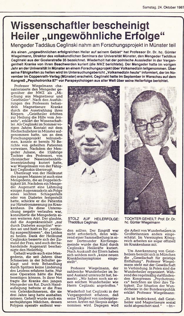 4 października 1987 roku w niemieckiej gazecie „Nord–West Zeitung” ukazał się wywiad z profesorem Wiegelmannem pod tytułem „Wissenschaftler bescheinigt Heiler ungewohnliche Erfolge” (Naukowiec potwierdza niespotykane osiągnięcia uzdrowiciela).